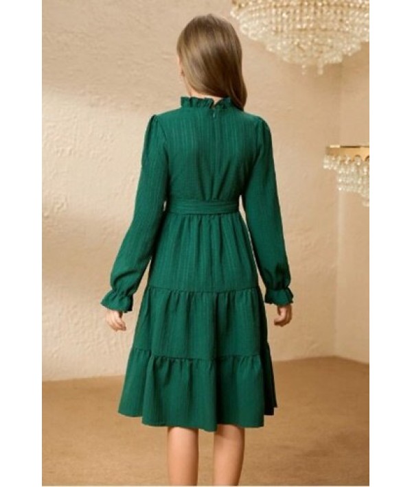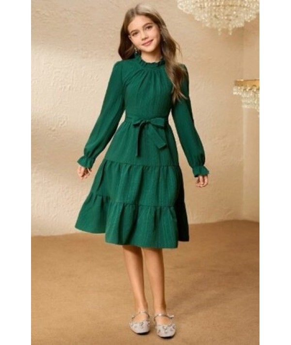 Kız çocuk yeşil kuşaklı elbise ayrobin kumaş